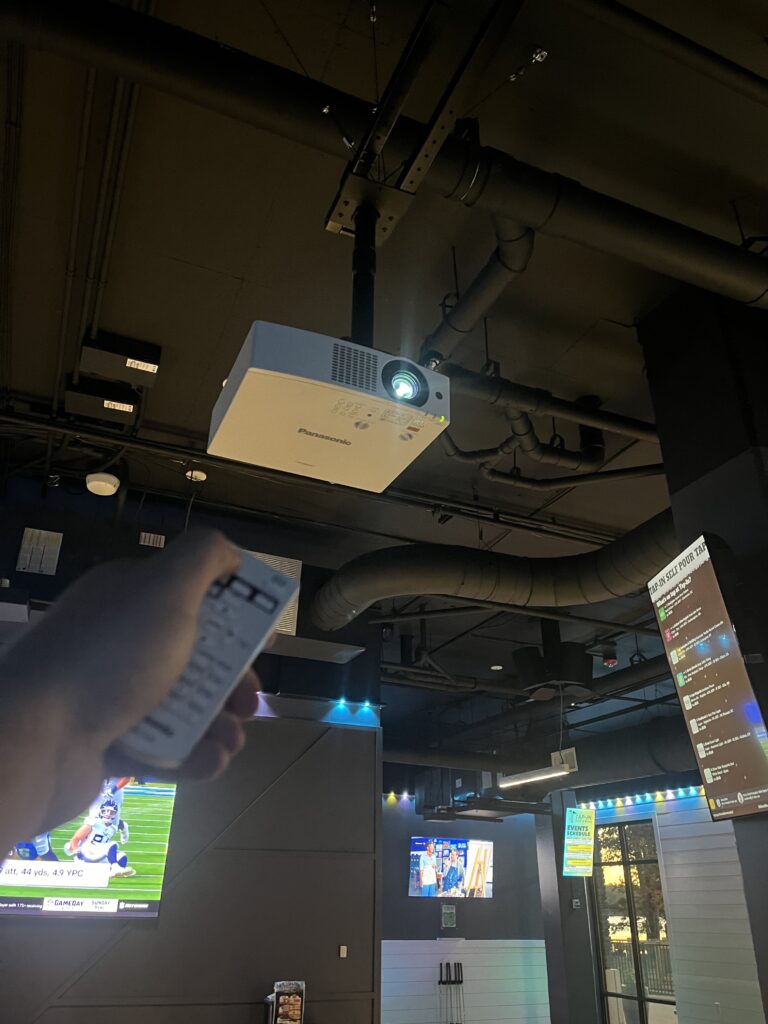 All of our simulators will be ready to use during off-hours. Simply grab the white remote at each computer, point it at the projector, and press the power button to turn on the projector. Please turn the projector off when you are finished playing! Reference pictures at the bottom of this page.